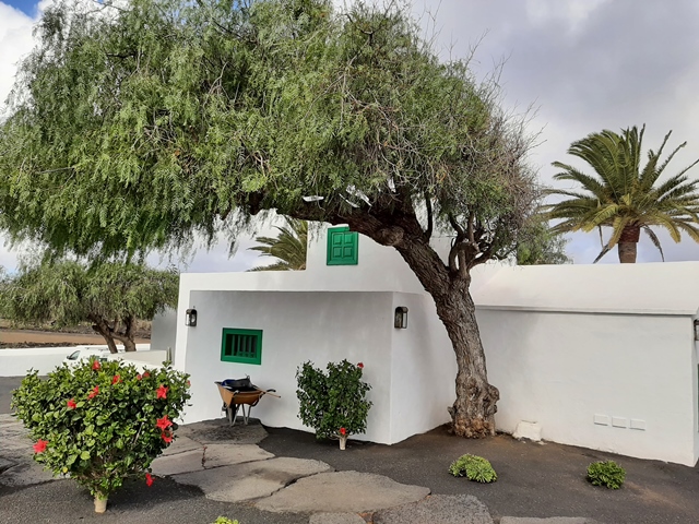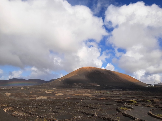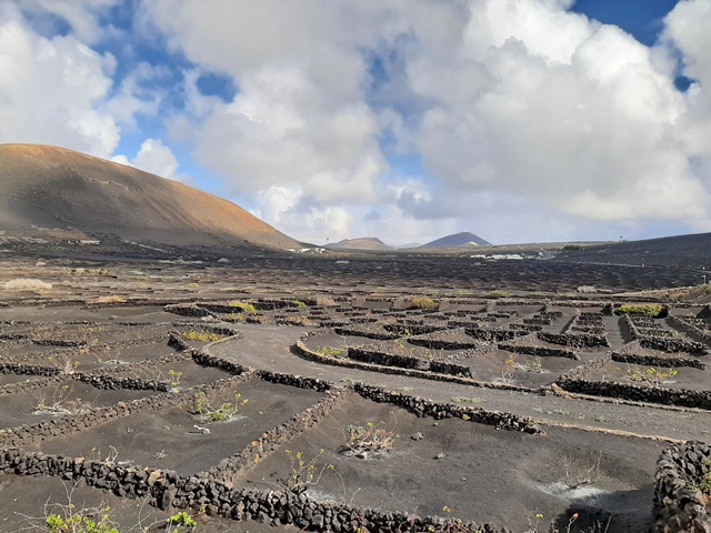 Het landschap is grotendeels vrij kaal en zwart van het lavagruis. De bewoners bouwen, om landbouw toch nog enigszins mogelijk te maken, muurtjes om de gewassen heen die zowel de wind tegenhouden als het vocht opvangen. Door het landschap te bestrooien met lavazand wordt de vochtigheid van de omgeving opgevangen. Verder zijn er natuurlijk fraaie stranden, waar zich ook de toeristen bevinden. We lezen ergens dat Lanzarote vooral in trek is bij senioren buiten het seizoen, nou dan zitten we dus goed. Dat wisten we overigens al, want in 2003 hebben wij het eiland ook al eens bezocht. We hebben toen het hele eiland gezien, nu moesten wij ons noodgedwongen beperken tot enkele hoogtepunten.