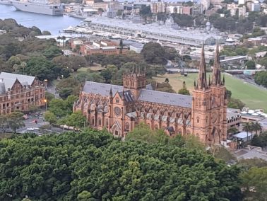 We vertrekken op 2 januari ’s ochtends vroeg van Schiphol en komen op 3 januari tegen de avond aan in Sydney. We laten ons naar ons hotel in Central Business District rijden en lopen even later nog wat rond in de buurt. Het is zaterdagavond en omdat het een echte zakenwijk is met bijna alleen maar zeer hoge gebouwen is er weinig te beleven op straat: geen gezelligheid, geen vertier. Daarvoor moet je 1 of 2 kilometer verder naar het oosten: Woolloomooloo en King’s Cross. De volgende ochtend, zondagochtend, wandelen we naar het nabijgelegen Hyde Park. Het is zonnig weer, het park is in zondagsrust. Een enkele jogger of muzikant, meer niet. In het park kun je de Sydney Tower zien, en aan de andere kant ligt St. Mary’s Cathedral. We wandelen naar Townhall Square, een mooi ruim plein, levendig ook met het fraaie stadhuis.