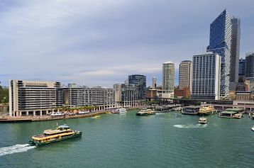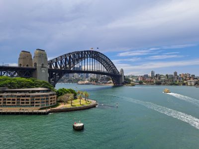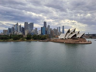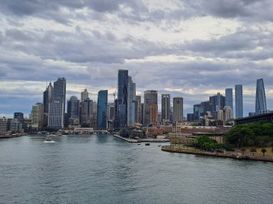 We hebben helaas niet veel tijd voor deze metropool. Rond 12 uur moeten wij ons melden op ons schip, dat in de haven onder de Harbour Bridge ligt. De sfeer rond de haven van Sydney is zomers en gezellig druk: het iconische Opera House, Circular Quay, met op de achtergrond de wolkenkrabbers van het centrum, Harbour Bridge en de zondagsmarkt in The Rocks, de oudste wijk van de stad. We overzien dit alles vanaf de negende verdieping van ons schip, we hebben bijna 360 graden zicht op alles. Dat levert mooie foto’s op, een weids zicht op deze metropool, waar de onweerswolken langzaam optrekken richting stad. We gaan varen en zien deze fraaie Sydneybeelden heel langzaam kleiner worden en verdwijnen. De reis is begonnen!