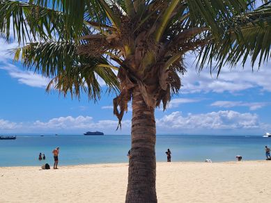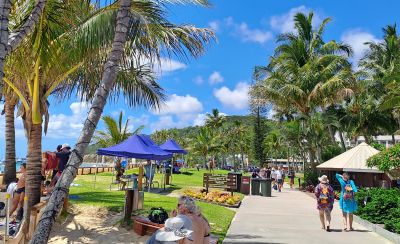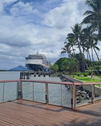 Zoals gezegd zal, na Cairns, het tropische depressieweer ons een tijdje blijven achtervolgen. Op de volgende drie bestemmingen regent het vaak (lichtjes) en is het vooral somber en grijs. Jammer, want de eilanden zijn prachtig. Het is wel zeer warm. Pas op het prachtige Fiji, waar we uiteindelijk vijf dagen zullen blijven, knapt het weer behoorlijk op. Dat blijft zo, ook in Nieuw-Zeeland. Ondanks het soms slechte weer genieten wij volop.
