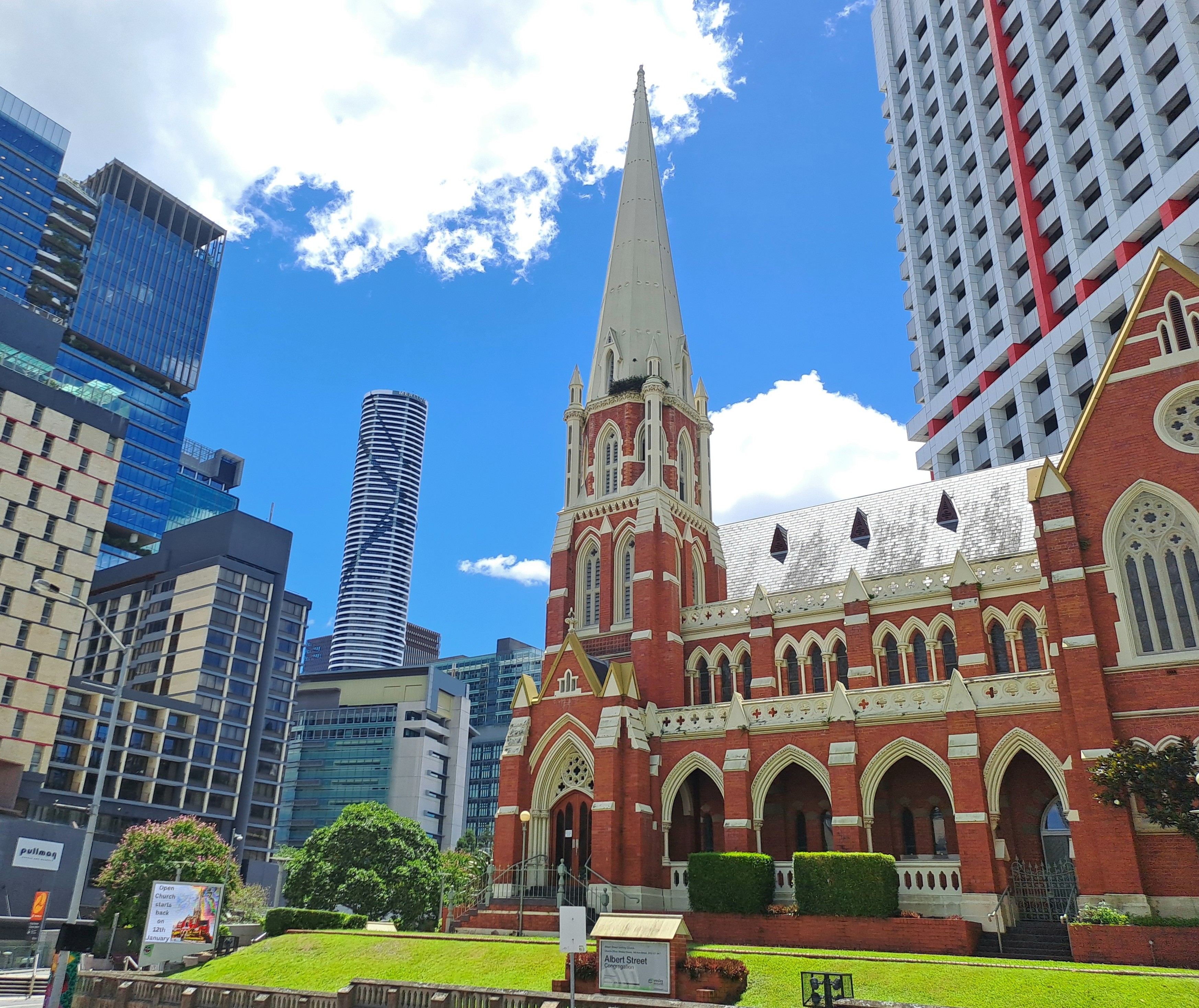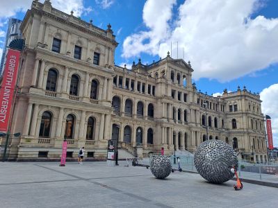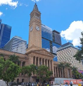 Hoewel wij vooraf begrepen dat er geen enkele verbinding is tussen de haven, die 23 kilometer van het centrum ligt, en het centrum zelf, rijdt er tot onze verrassing toch een shuttle. Deze brengt ons in drie kwartier naar het King Georgeplein in het centrum. Een druk plein met de iconische Brisbane City Hall Clock Tower. Via Albert Street en Queen Street, een echte winkelstraat, lopen we via de Victoriabrug over Brisbane River naar de zuidkant van de stad.