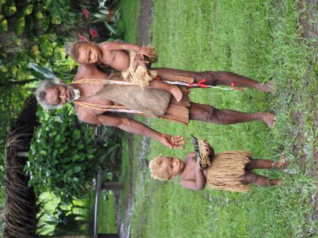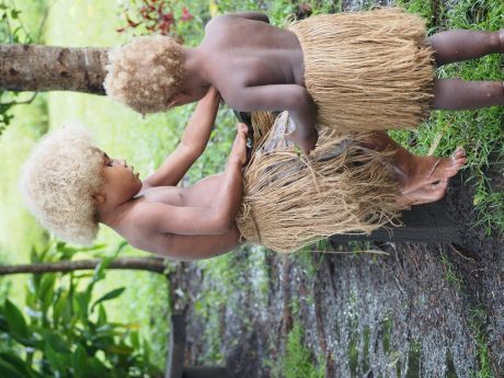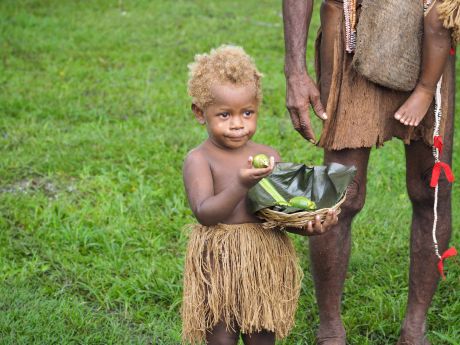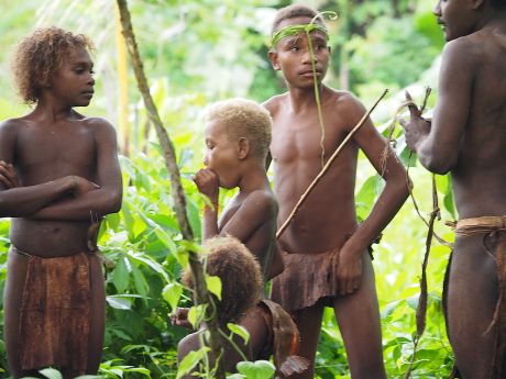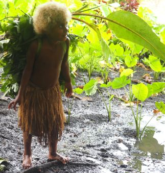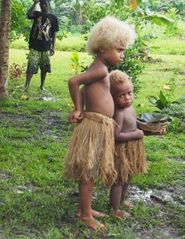 Na drie kwartier stopt onze auto. We moeten uitstappen. De auto kan niet verder rijden over het bospad, omdat het door de hevige regens van de afgelopen dagen, is veranderd in één grote modderpoel. We zullen verder moeten lopen door deze modderpoel. Dat is geen gemakkelijke opgave. Bij ieder stap zakken we of diep weg in de modder of we dreigen uit te glijden en languit in de modder te vallen. Dat overkomt Lione één keer. Ondanks de sterke armen van Hotomaibewoners, die ons begeleiden, blijft het een redelijk zware tocht. Maar we worden beloond. Na enige tijd zijn we in het dorp. De situatie is hier niet beter: overal zompen we door de modder, maar hier en daar zijn planken neergelegd en de bewoners zijn erg hulpvaardig. Het regent ook nog eens gestaag door en behalve ‘modder-begeleiders lopen er ook bewoners mee die een palmblad boven ons hoofd houden. Zelden hebben we zulke aardige en hulpvaardige locals gezien. Een aantal kinderen heeft blond haar. Een vreemde combinatie: Melanesisch uiterlijk met blond kroeshaar.