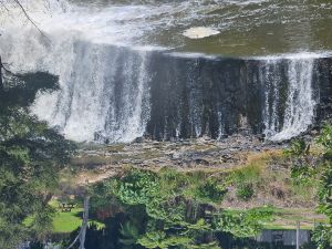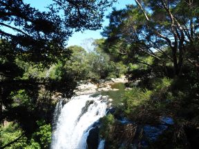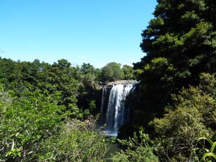 Een paar kilometer van Paihia liggen de Haruru Falls. Dit is een brede, hoefijzervormige waterval in de Waitangi River. De naam 'Haruru' betekent in het Māori "groot lawaai" of "continu gedreun", wat vooral merkbaar is na hevige regenval wanneer de waterval met grote kracht naar beneden stort. De waterval is ongeveer 5 meter hoog en heeft een zeldzame hoefijzervorm. Hoewel niet bijzonder hoog, staat het bekend om zijn breedte en het volume van het water. We schieten hier wat foto’s en genieten van het uitzicht.
