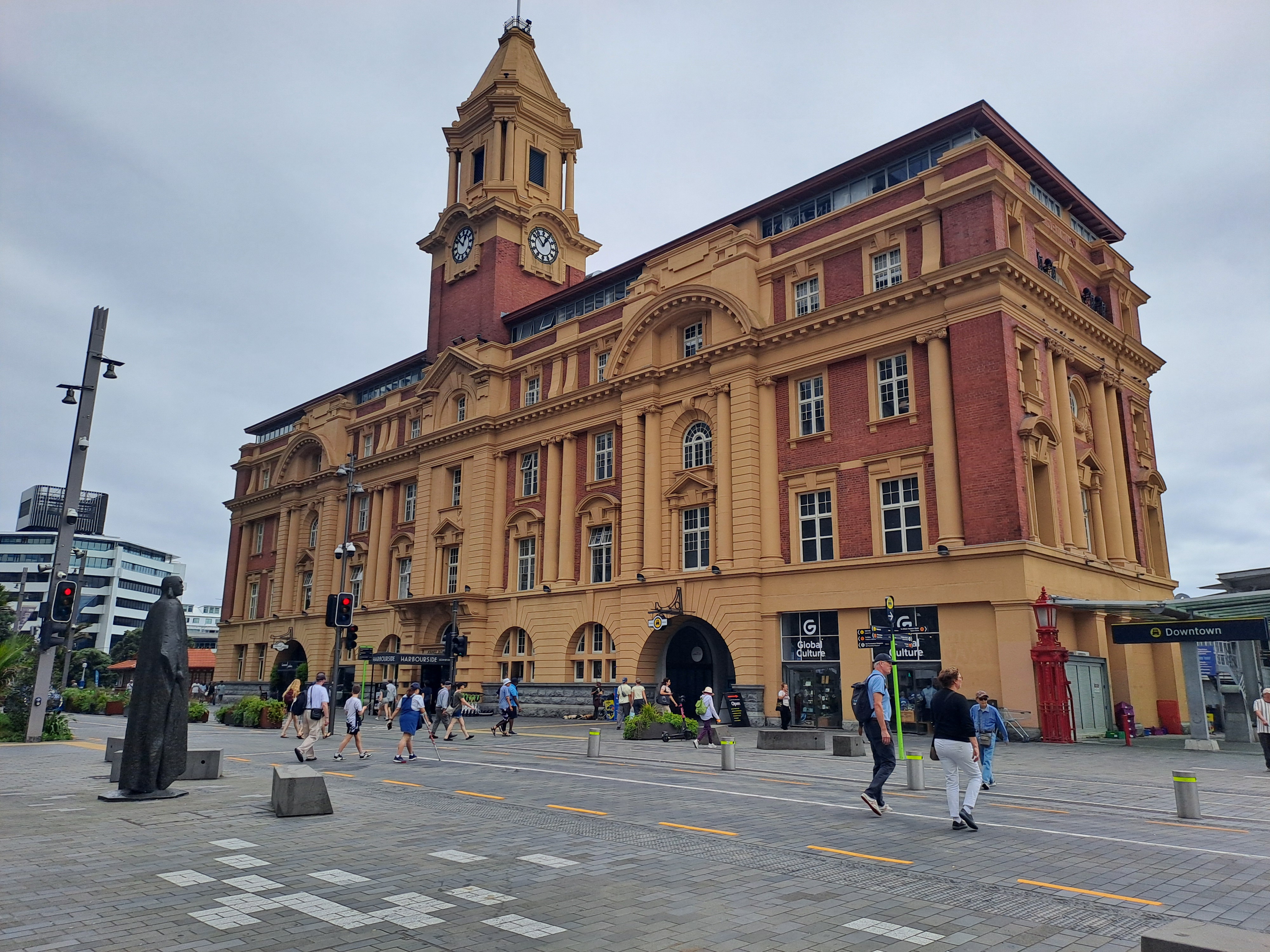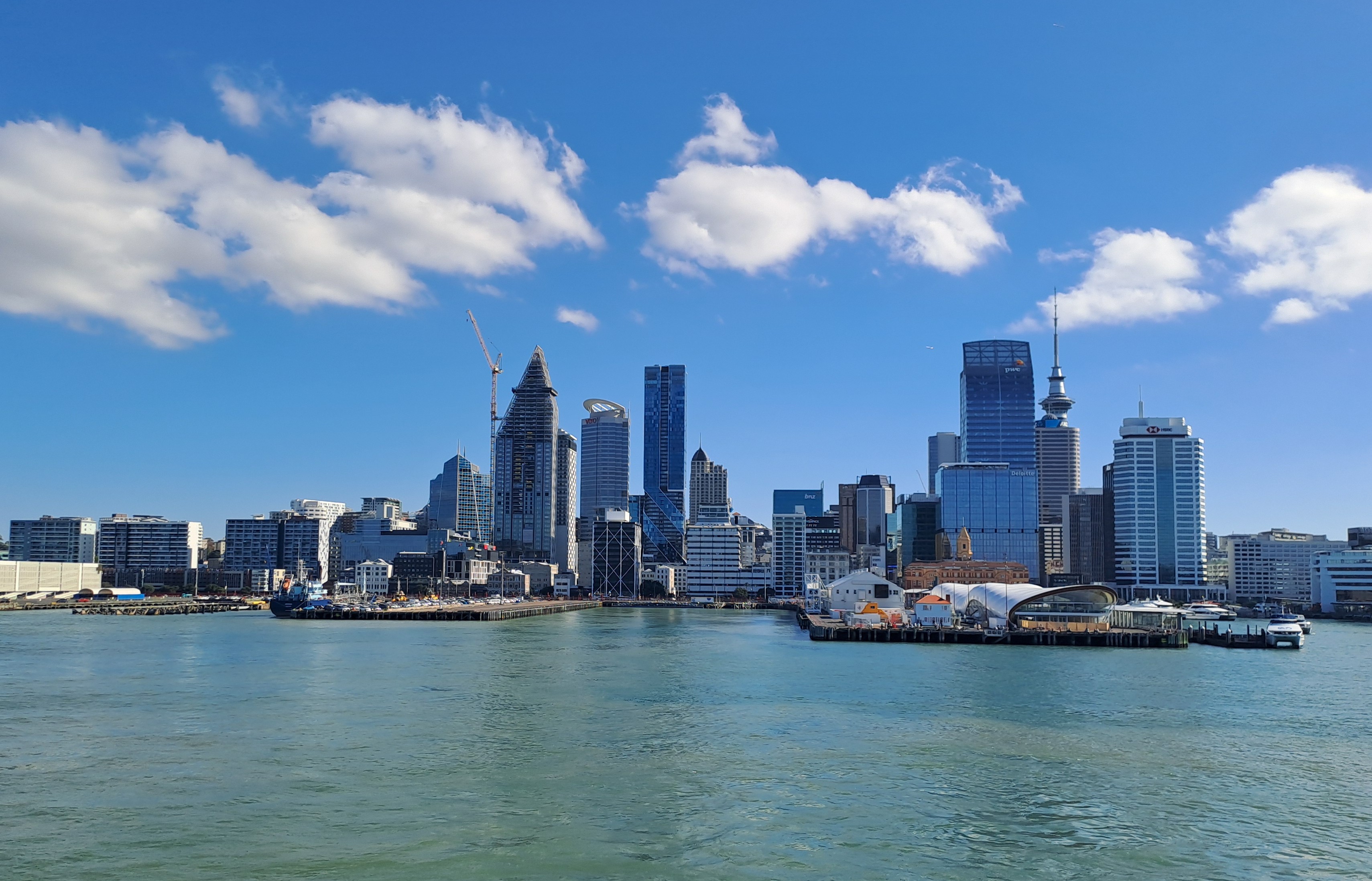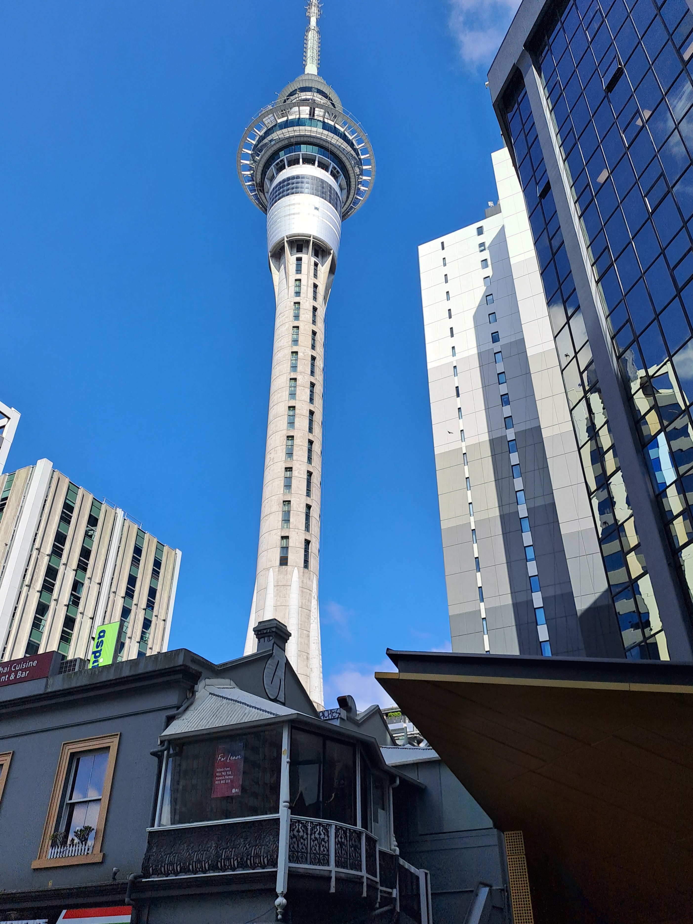 Auckland, bekend als de "City of Sails", is de grootste stad van Nieuw-Zeeland en een dynamische metropool (2,7 miljoen inwoners), die is gebouwd op een slapend vulkanisch veld met meer dan vijfitg vulkaankegels. Het is, zoals in de meeste plaatsen in Nieuw-Zeeland, hier dan ook heuvelachtig, buiten het compacte centrum. Als we de haven binnenvaren hebben we een fantastisch zicht op de skyline. Hoge gebouwen en de Skytower. Deze toren is met een hoogte van 328 meter een van de meest iconische herkenningspunten van Nieuw-Zeeland. De toren biedt een panoramisch 360-graden uitzicht over de stad, We gaan hier niet omhoog, we gaan dit in Melbourne doen.