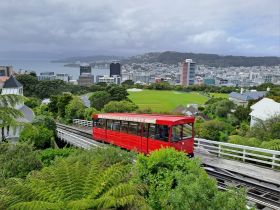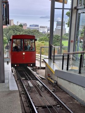 We nemen de shuttle van het schip naar 280 Lambdon Quay, daar is het stationnetje van de cablecar. De cablecar stopt op hoogste punt van Mount Victoria, een heuvel ten noorden van de binnenstad van 196 meter hoog, die je een uitzicht biedt op downtown Wellington en de zee.