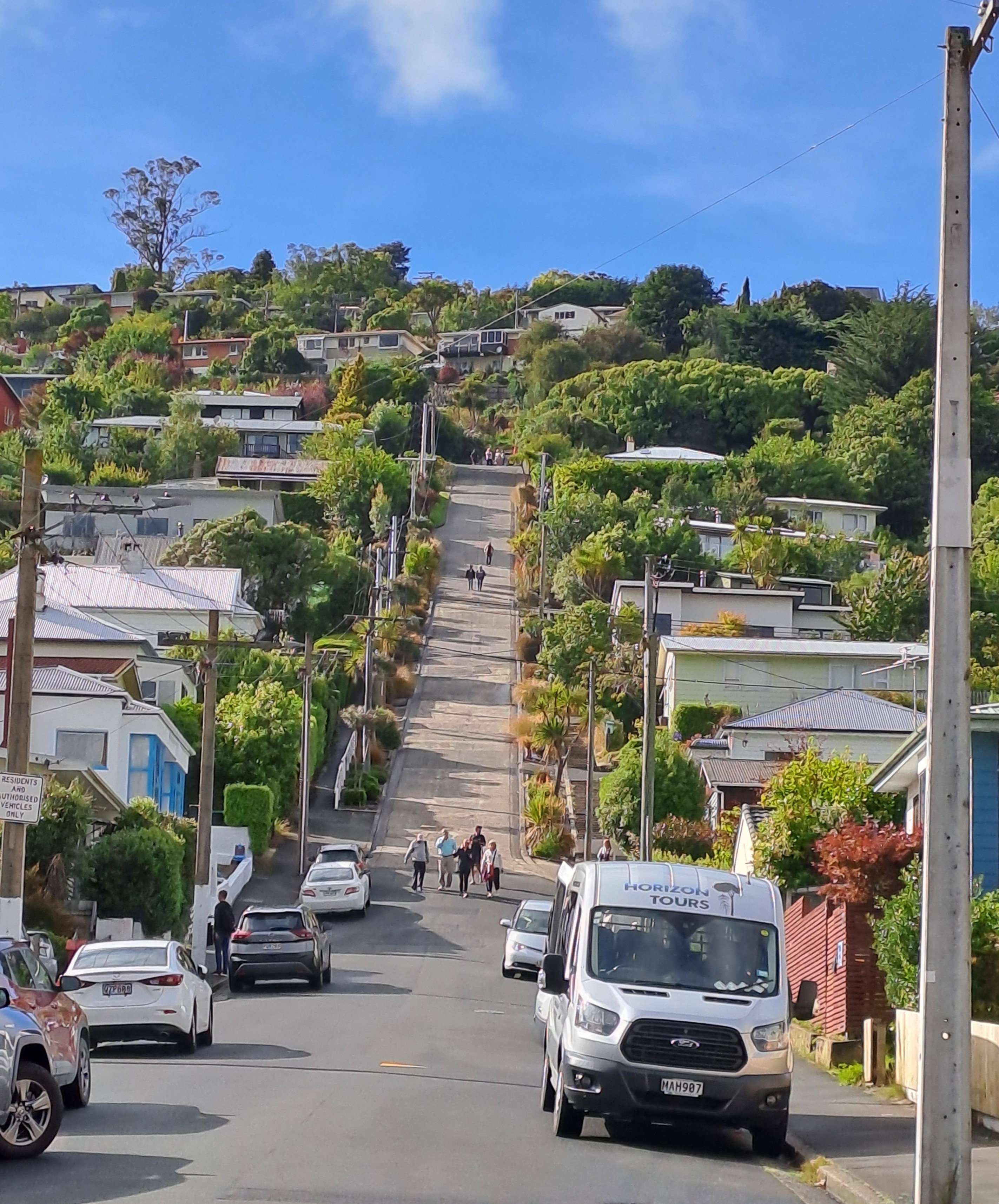 In het noorden van de stad bevindt zich ook de steilste bewoonde straat ter wereld! Baldwin Street heeft een stijgingspercentage van 34,8% en je doet er ongeveer tien minuten over om de 350 meter lange straat omhoog te lopen. Op foto’s lijkt het nogal mee te vallen, maar nu wij er in het echt staan is de straat toch echt heel steil. Het schijnt dat het ontwerpen van de wijk waarin de straat ligt gebeurde door mensen van achter hun bureau in Schotland, ze waren nog nooit op het Zuidereiland geweest. De staat werd op de kaart getekend, zonder dat men door had dat dit vanwege de steile heuvel eigenlijk onmogelijk was.