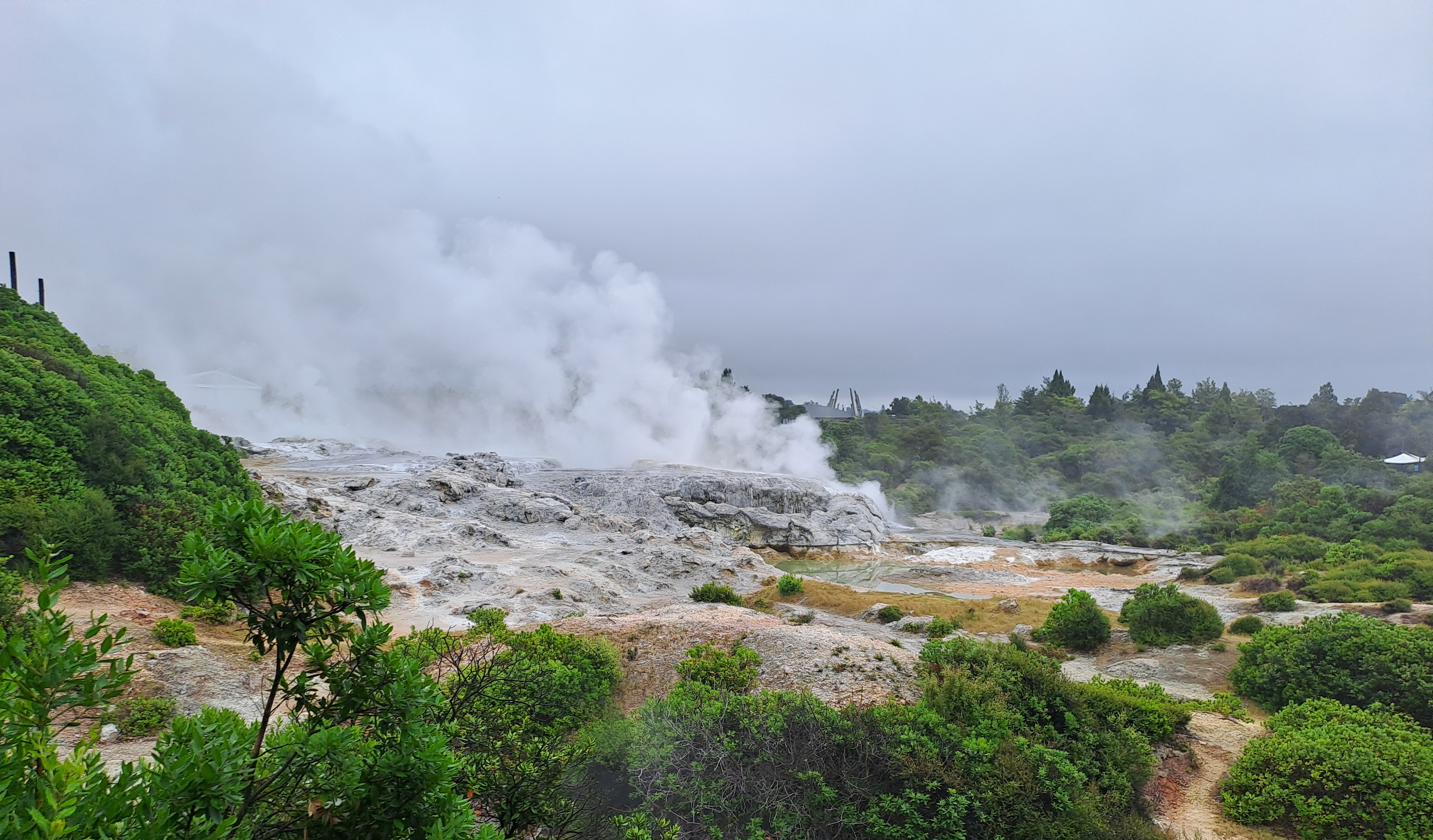 Whakarewarewa is een levendig dorp gelegen in dit bijzondere landschap van uitbarstende geothermische activiteit, hete thermale bronnen en hete, borrelende modderpoelen. Je kunt hier als bezoeker rondleidingen volgen onder leiding van directe afstammelingen van de oorspronkelijke gidsen om te zien hoe de gezinnen van het dorp (ongeveer 900 inwoners) momenteel op het actieve geothermische plateau verblijven. Uiteraard maken wij zo’n rondleiding.