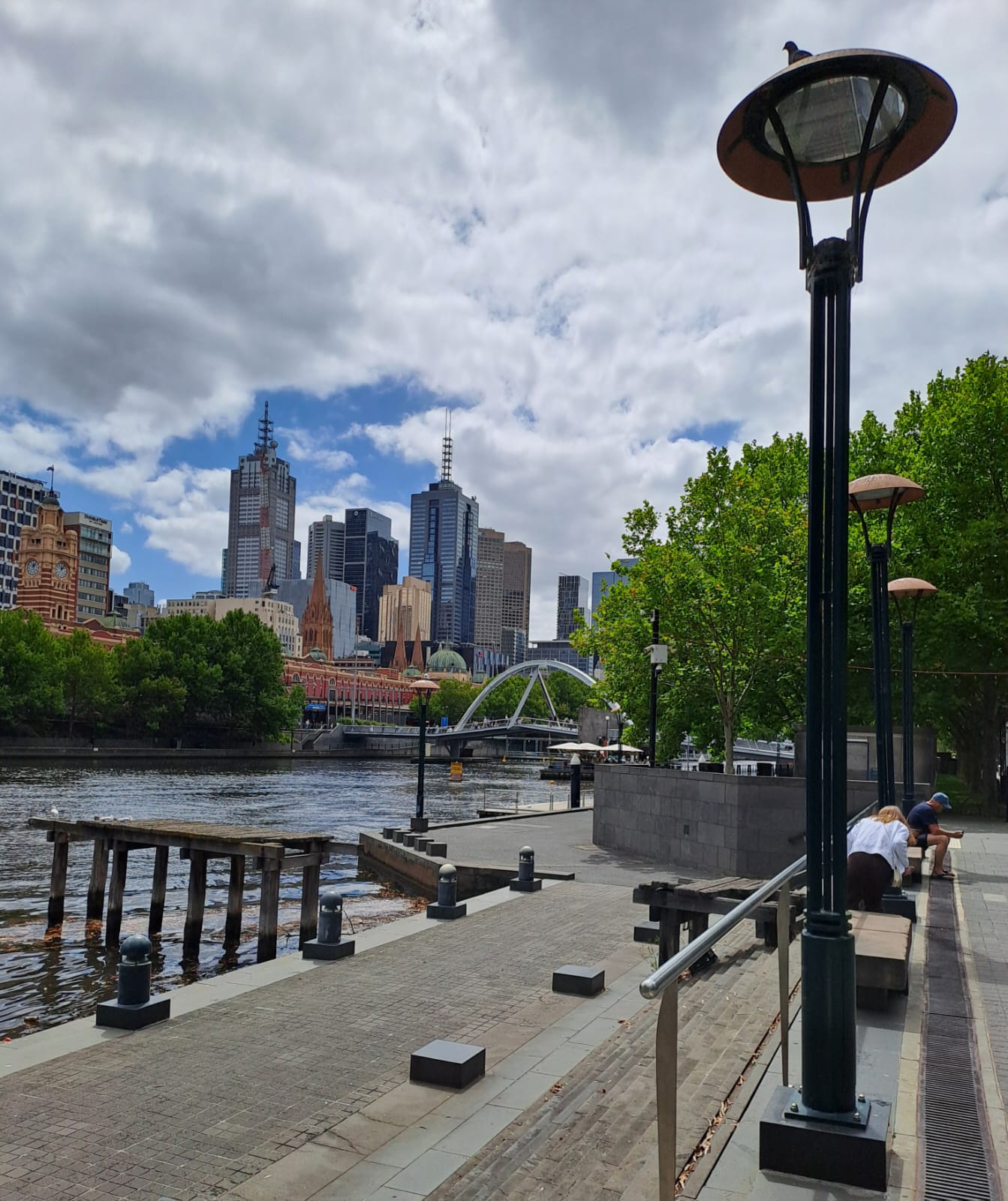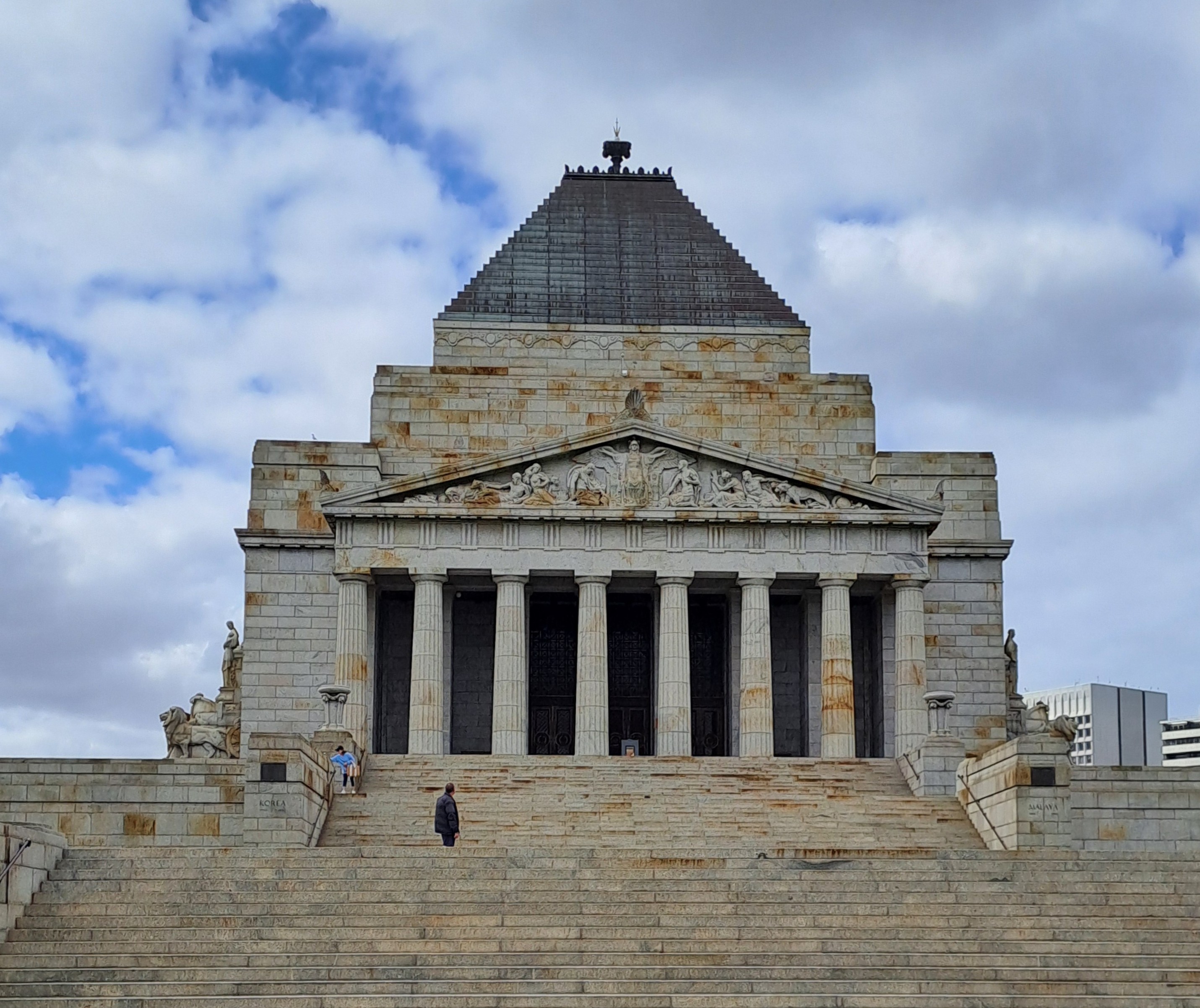 Door de parkachtige omgeving (aan parken geen gebrek in deze stad!) rijden we naar de Royal Botanical Gardens. Vlakbij staat de Shrine of Remembrance, het nationale oorlogsmonument van de staat Victoria. Dit markante monument is gebouwd in 1934 om veteranen uit de Eerste Wereldoorlog te eren en tegenwoordig alle Australiërs die hebben gediend in oorlogen en vredesmissies. Het monument is gelegen in het Kings Domain aan Birdwood Avenue en biedt naast herdenkingsruimtes ook uitgebreide museale tentoonstellingen en een panoramisch uitzicht over Melbourne. We waren hier in 2006 ook al geweest, maar het maakt toch weer indruk. Langs de Yarrarivier, nog steeds in zuidelijk Melbourne, rijden we naar de South Bank, een moderne wijk met een winkelgebied en wandelgebied langs de rivier, van waar je een mooi zicht hebt op de eerder genoemde vierhoek Flinders Street station, stadhuis, St. Pauls kathedraal en Federation Square.