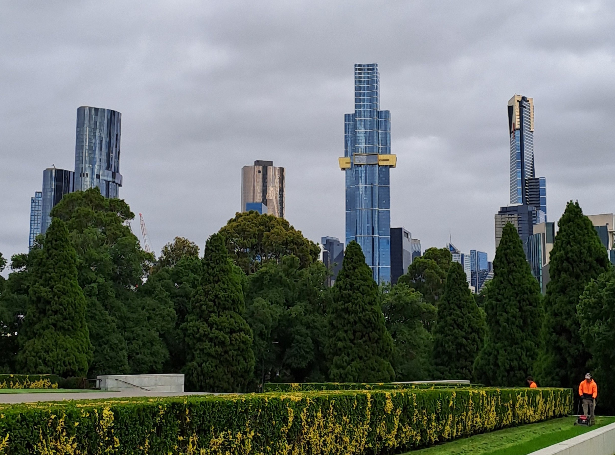 Door de parkachtige omgeving (aan parken geen gebrek in deze stad!) rijden we naar de Royal Botanical Gardens. Vlakbij staat de Shrine of Remembrance, het nationale oorlogsmonument van de staat Victoria. Dit markante monument is gebouwd in 1934 om veteranen uit de Eerste Wereldoorlog te eren en tegenwoordig alle Australiërs die hebben gediend in oorlogen en vredesmissies. Het monument is gelegen in het Kings Domain aan Birdwood Avenue en biedt naast herdenkingsruimtes ook uitgebreide museale tentoonstellingen en een panoramisch uitzicht over Melbourne. We waren hier in 2006 ook al geweest, maar het maakt toch weer indruk. Langs de Yarrarivier, nog steeds in zuidelijk Melbourne, rijden we naar de South Bank, een moderne wijk met een winkelgebied en wandelgebied langs de rivier, van waar je een mooi zicht hebt op de eerder genoemde vierhoek Flinders Street station, stadhuis, St. Pauls kathedraal en Federation Square.