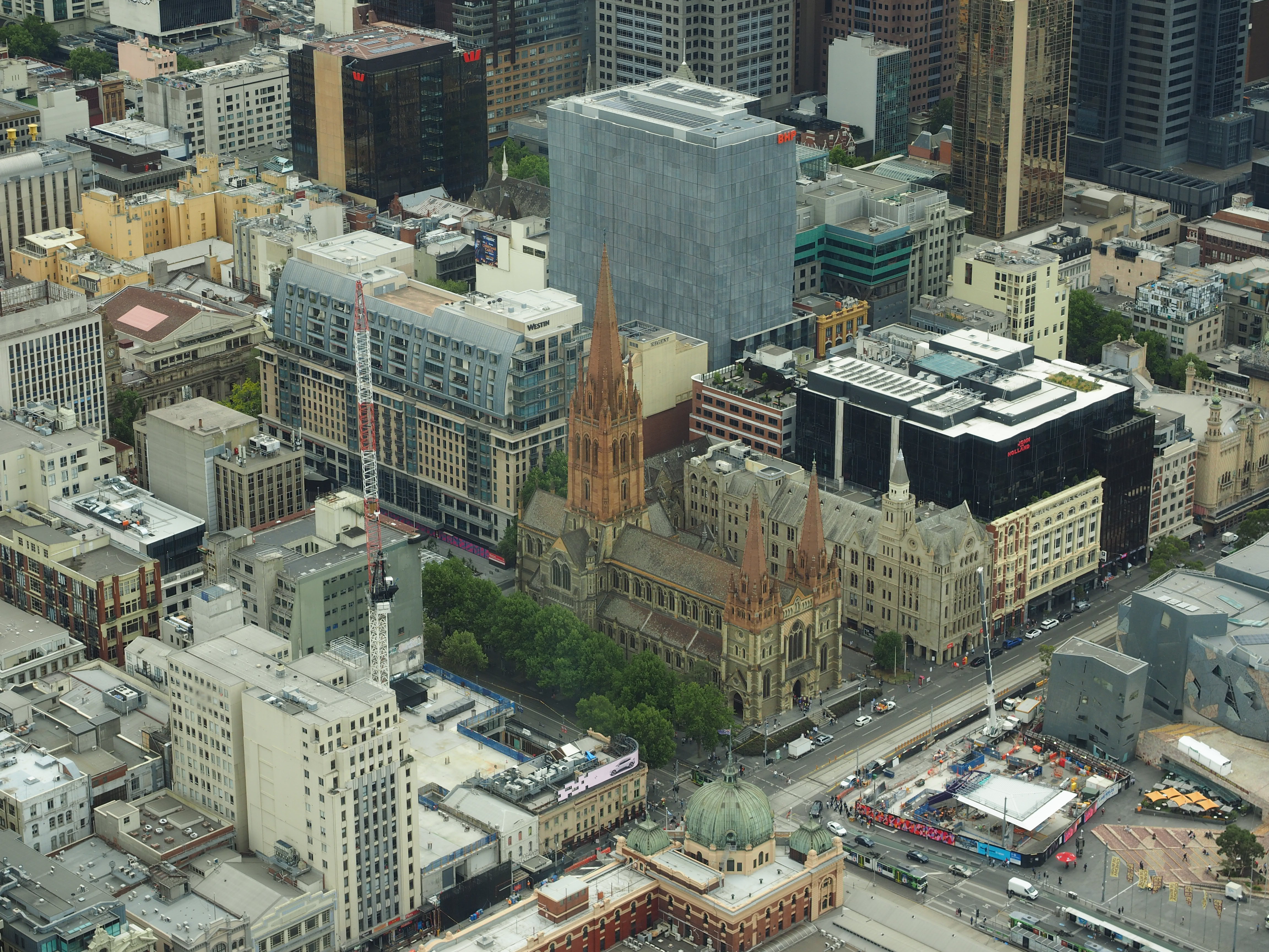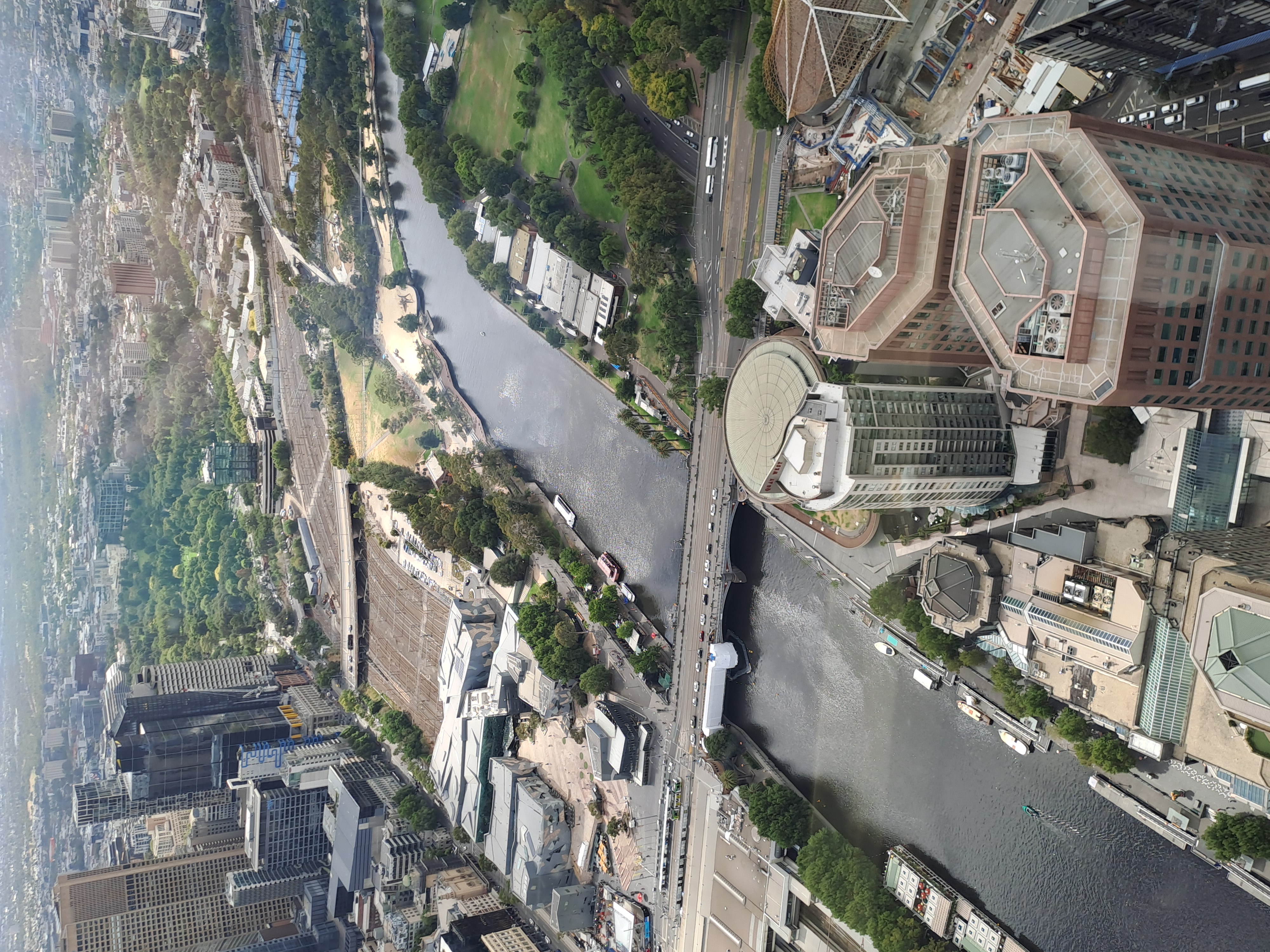 Hier bevindt zich ook het Skydeck, gelegen op de 88e verdieping van de Eureka Tower. Het is het hoogste observatieplatform op het zuidelijk halfrond. Het biedt een 360-graden panoramisch uitzicht over Melbourne en de omliggende regio, van de Dandenong Ranges tot Port Phillip Bay. De razendsnelle lift brengt je in 38 seconden boven. Het verblijf boven is fantastisch, ik zou wel uren naar beneden en in de verte kunnen kijken. We blijven er een half uur, want we moeten verder. We rijden het noorden van de stad binnen. Een kolossaal stadsdeel met veel oude gebouwen tussen de nieuwere wolkenkrabbers.
